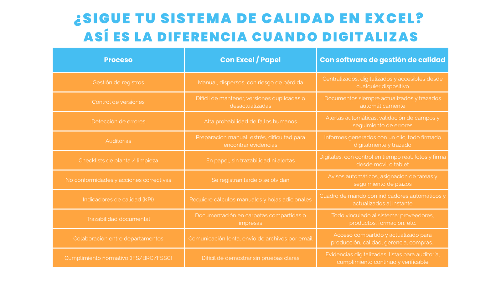 La automatización. Un software de gestión de calidad reduce errores, ahorra tiempo y permite una trazabilidad completa con alertas, asignación de tareas y generación de informes listos para auditoría. Con Excel, todo es manual y propenso a fallos.